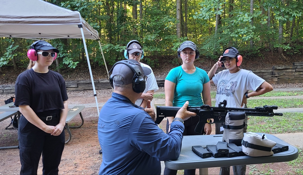 Discussing rifle shooting with Sociology of Guns students, Fall 2022. Photo by Sandra Stroud Yamane