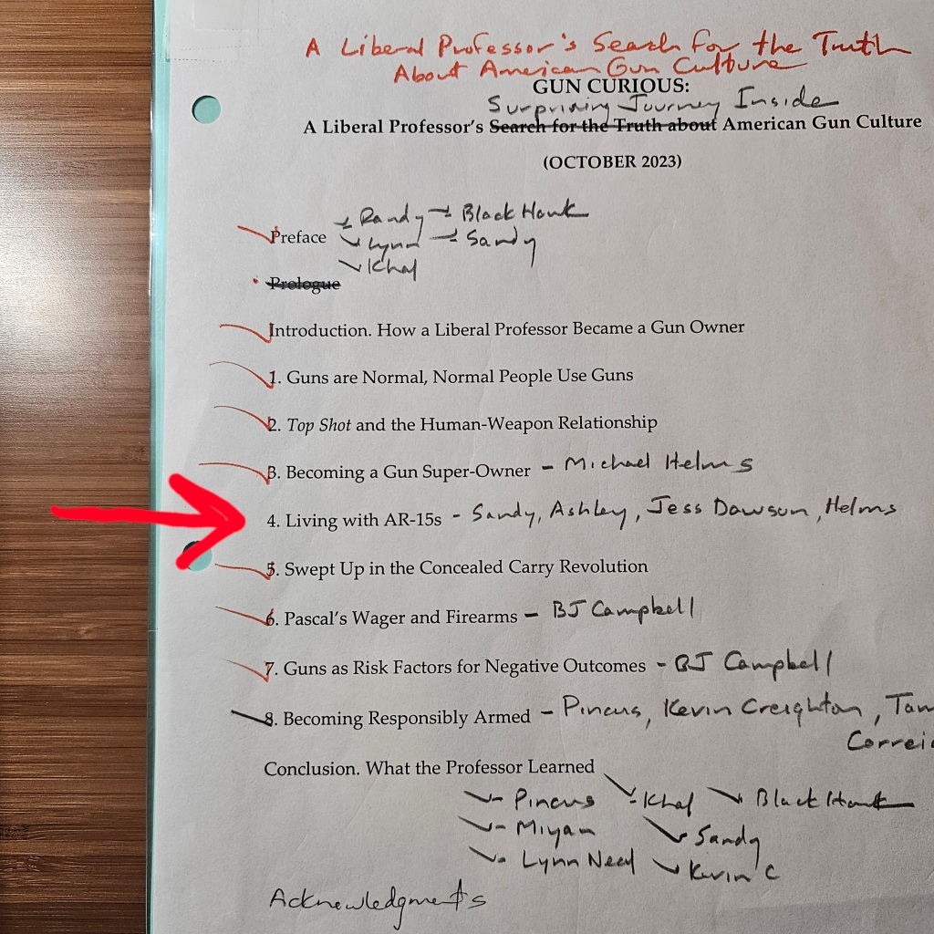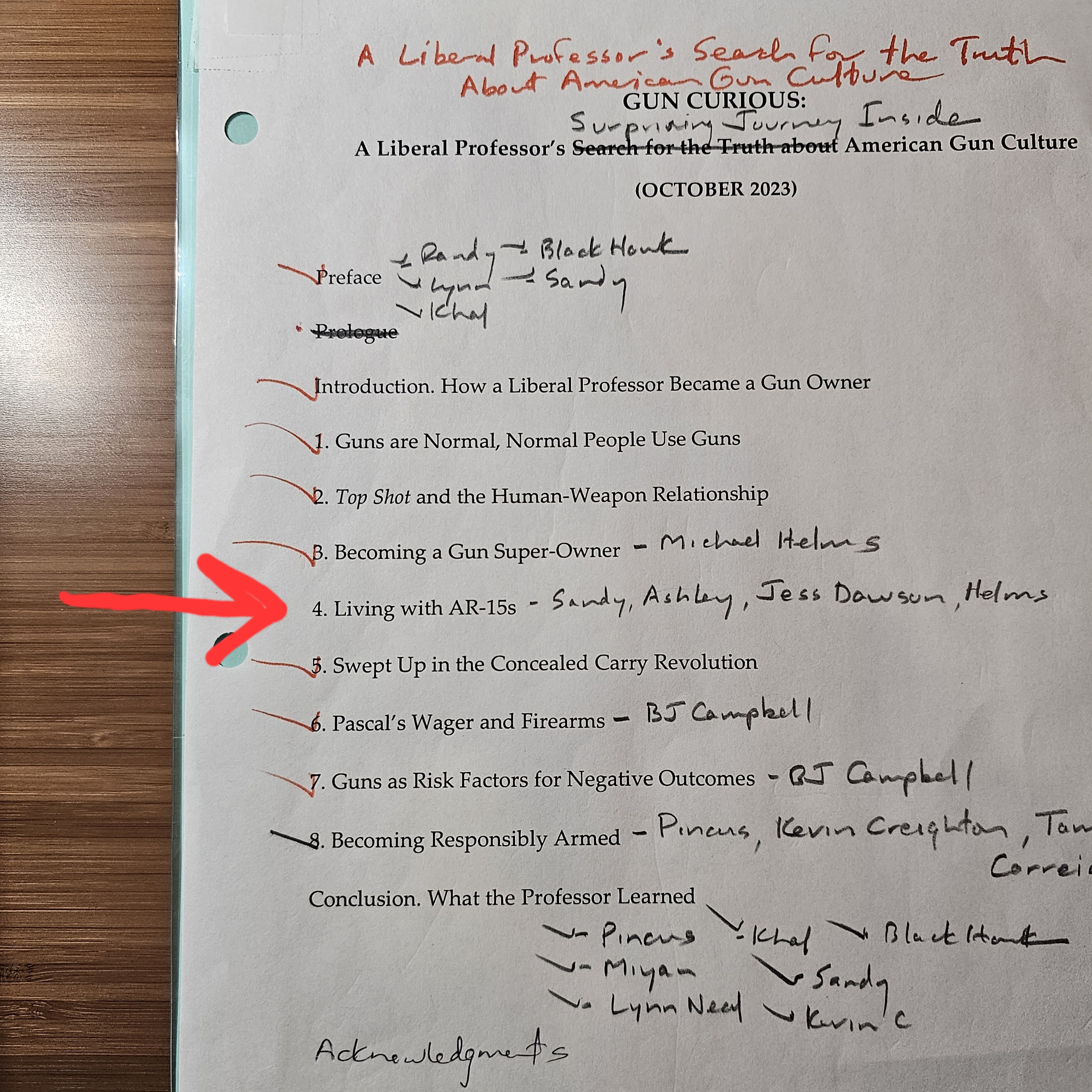 Last weekend, I went on a writing retreat to finish the final manuscript revisions for my book, Gun Curious (subtitle TBD). I got through the preface and 8 of the 10 chapters. I didn’t make it to the conclusion, but I also skipped a chapter in the middle. I revised the introduction, then chapters 1 to 3, then chapters 5 to 8. I skipped chapter 4.