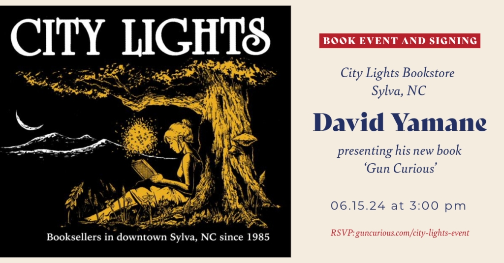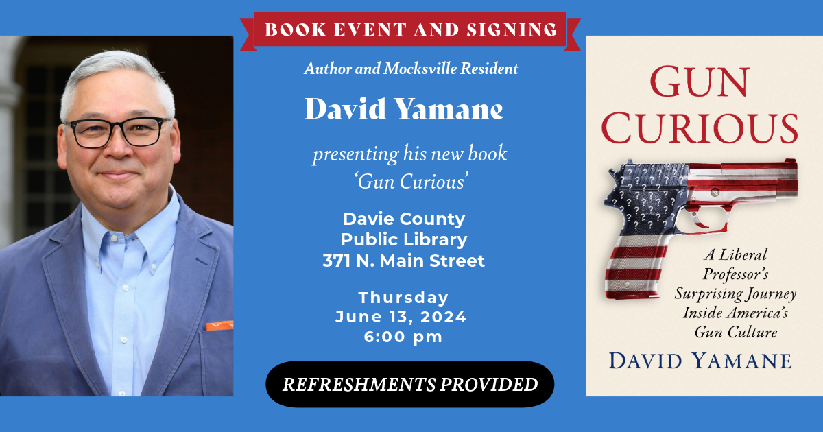 A couple of other upcoming face-to-face events if you’re interested. On Thursday, June 13th at 6:00 pm, I will be at the Davie County Public Library in Mocksville. Public libraries are “palaces of the people” and I’m excited to have the opportunity to talk about my story and the broader issue of guns in a town/county that played a huge role in my becoming a gun owner. More information here.