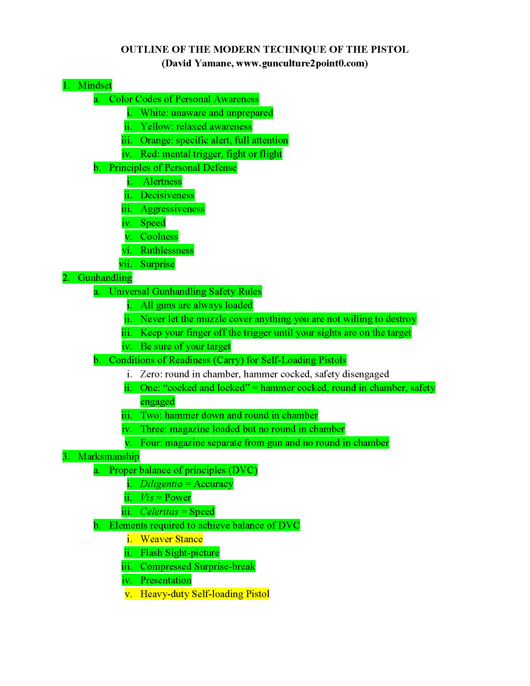 But if you look at the Modern Technique as a broader whole, the vast majority remains intact. I have taken the outline I posted previously and highlighted in green those parts that are still in evidence in “The Gunsite Experience” in 2017 and in yellow those which are different. As you can see, it is mostly green, with the exception of the Weaver stance and the heavy-duty self-loading pistol. (I leave readiness “Condition 0” white because it seems to be more of an add-on than an integral part of gunhandling in the Modern Technique as codified by Cooper.)