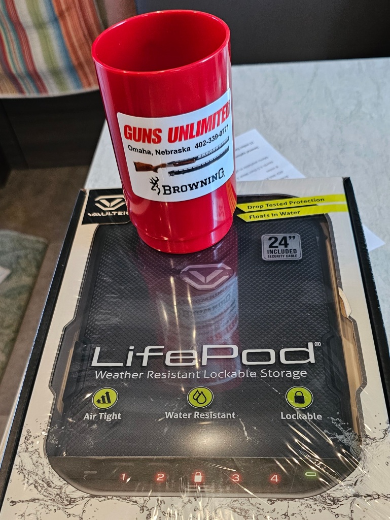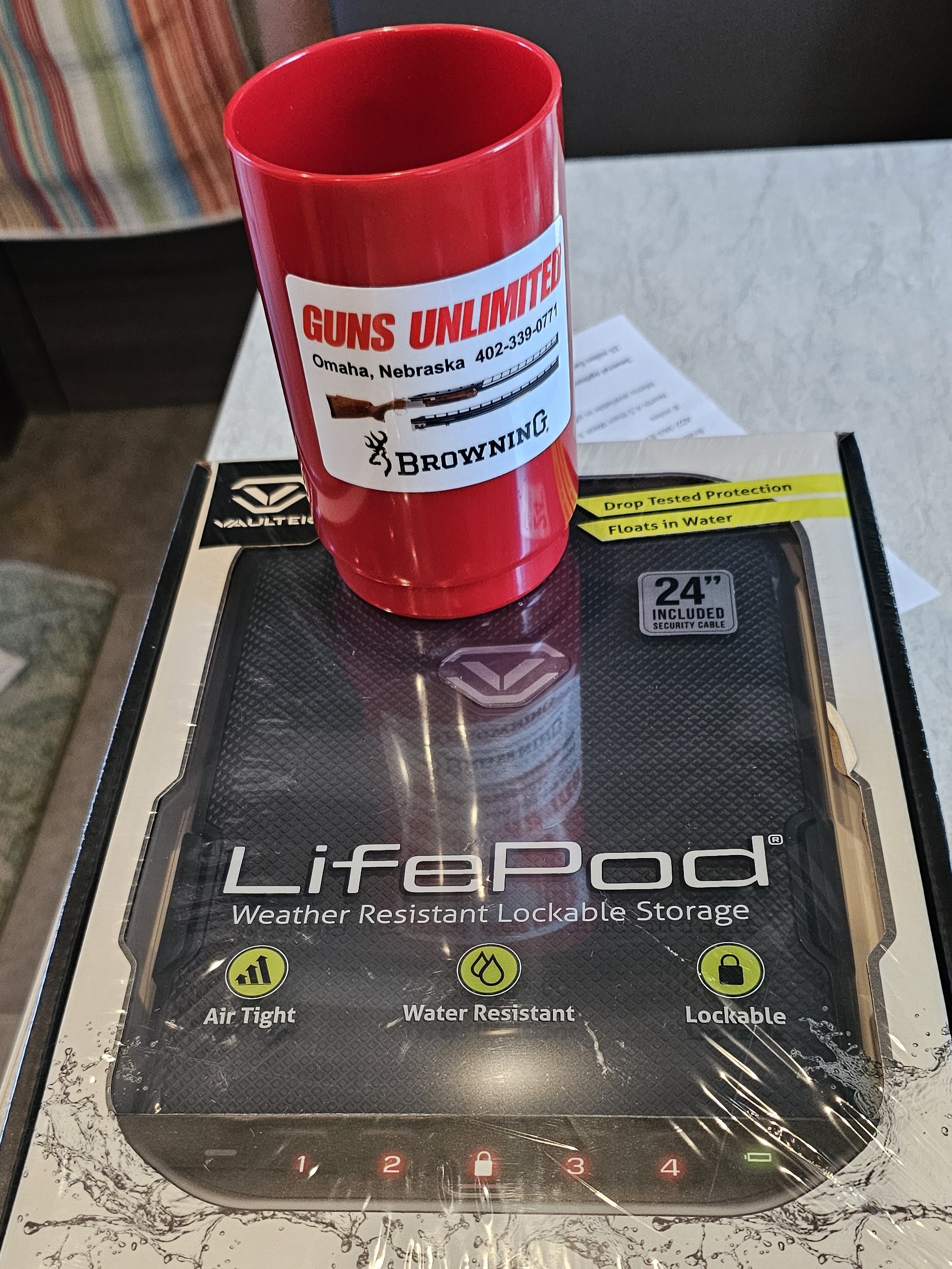 Wrapping up another interesting stop on my tour of America’s gun cultures, I bought a small gun safe and souvenir cup on my way out.