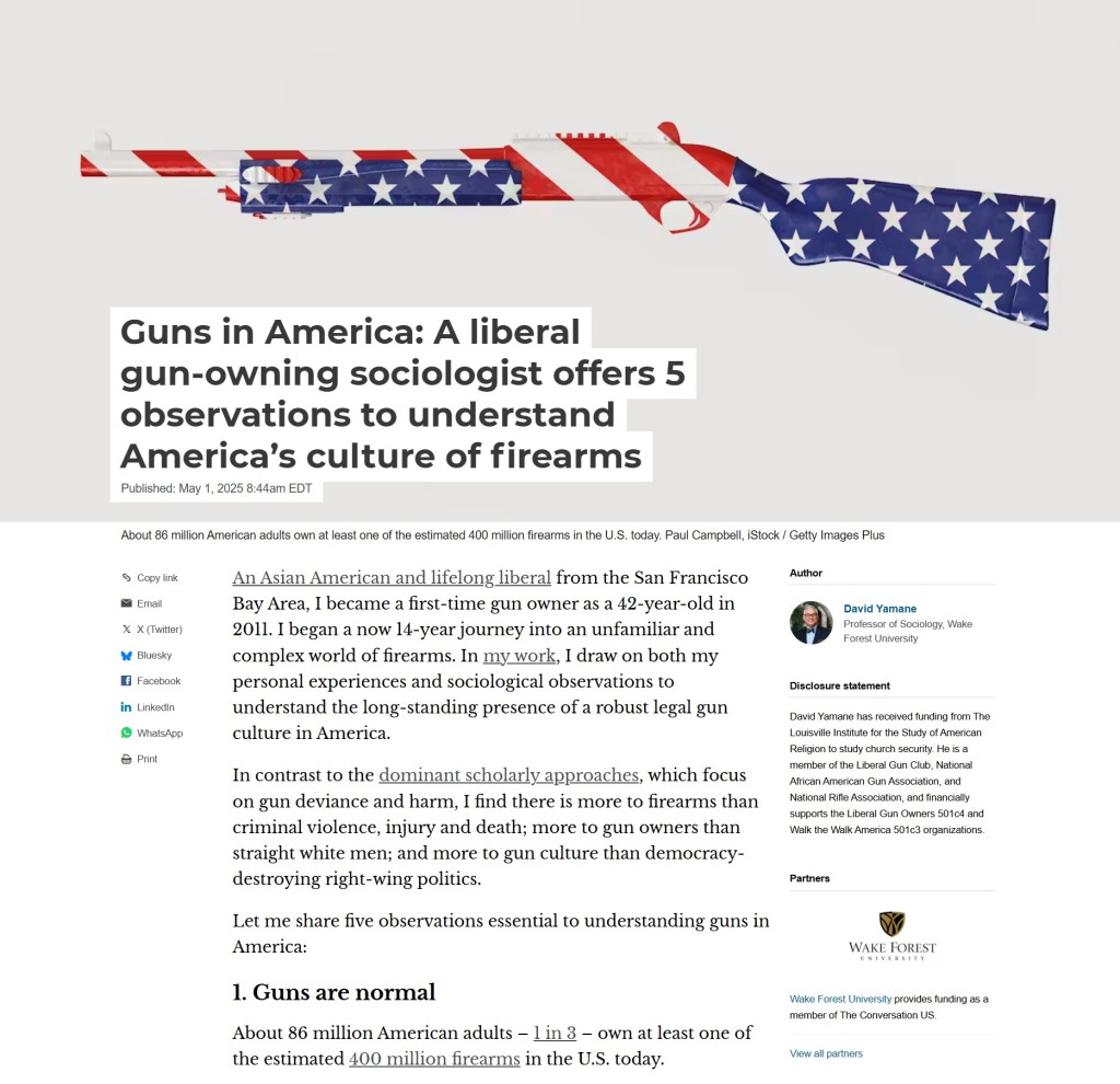 But I recently published a 900-word essay in The Conversation: “Guns in America: A liberal gun-owning sociologist offers 5 observations to understand America’s culture of firearms.”