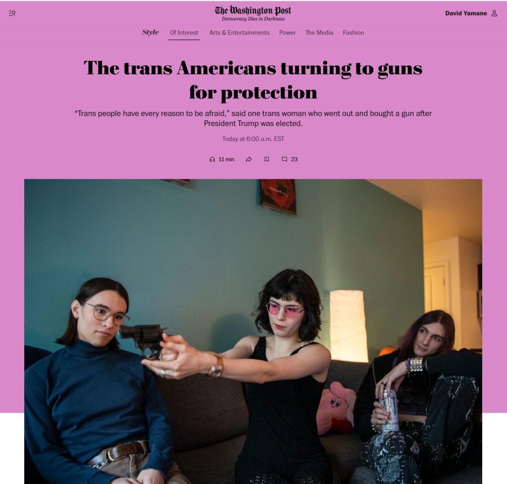 The Washington Post article on trans gun owners that I commented for in January is now out and I think the author, Hallie Lieberman, did a fine job.